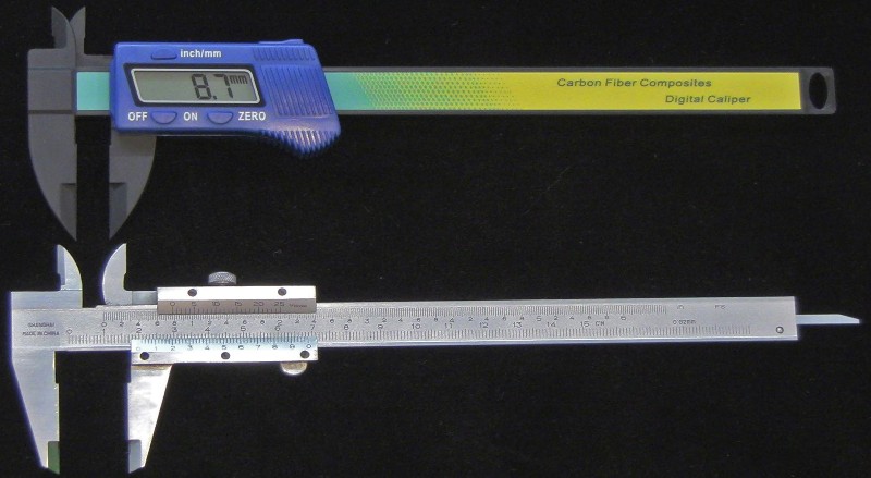 Além disso, cada escala é dividida em 10 divisões iguais e, portanto, tem uma contagem mínima de 0,1 mm cada. Ao tomar medidas, o braço móvel é ajustado de modo a encaixar os bicos ao redor ou no interior do objeto. As leituras de ambas as escalas, principais e vernier, são importantes para fazer a medida final. No entanto, vale notar que as leituras em ambas as escalas são tomadas de maneira diferente. A leitura da escala principal é tomada olhando onde a marca, que está apenas à esquerda de 0, coincide com a escala de vernier, enquanto que a leitura secundária é tomada olhando essa marca na escala de vernier que coincide ou está extremamente perto de uma marca na escala principal.